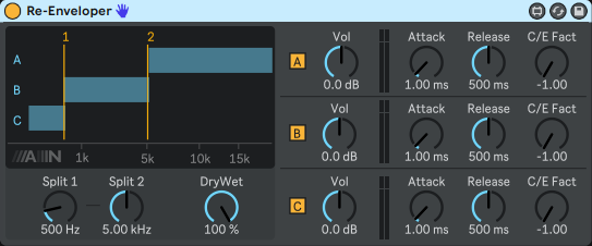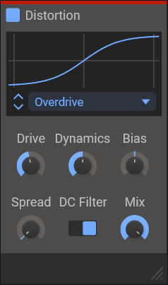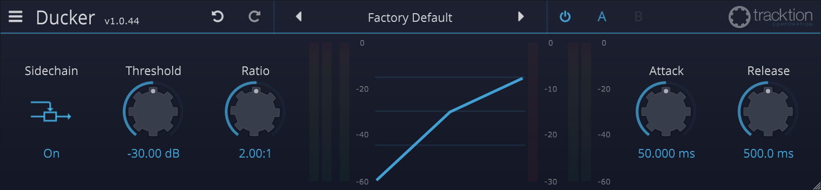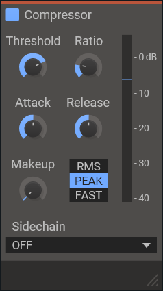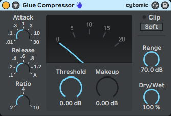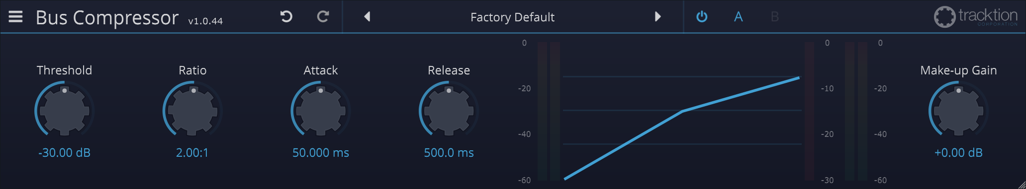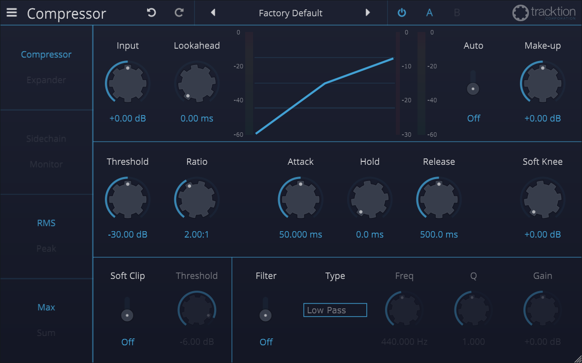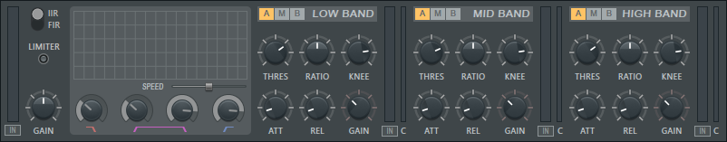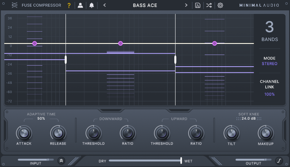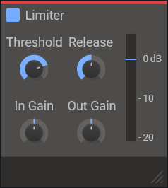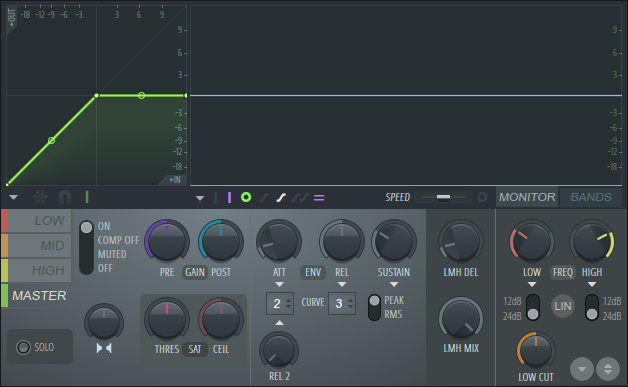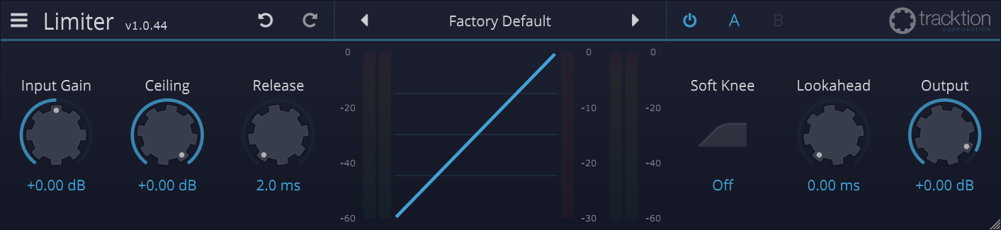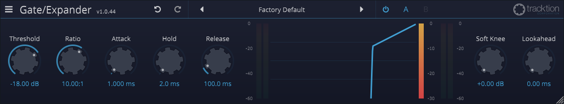 Dynamics processing featuring upward and downward compression as well as expansion. Thresholds and ratio are controlled by clicking and dragging on the visualization in the upper part of the plugin interface. The visualization shows how input levels are mapped to output levels by the dynamics processing. The current input and output levels are marked in the visualizer by a moving disc.