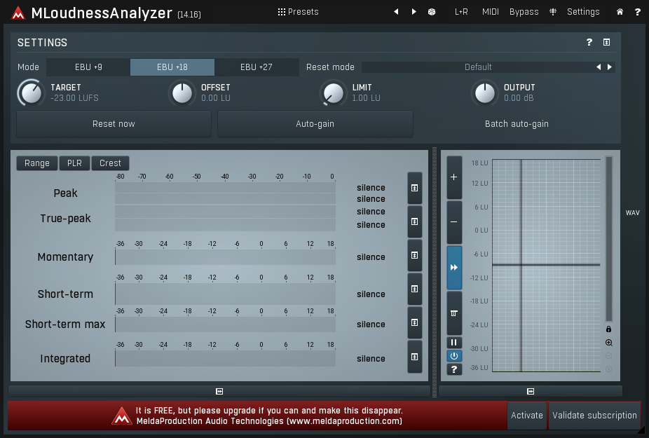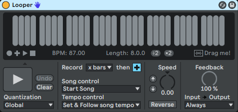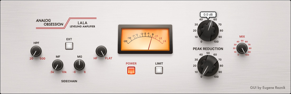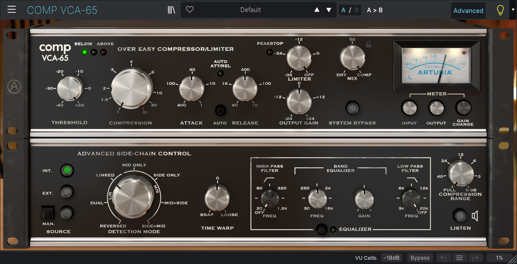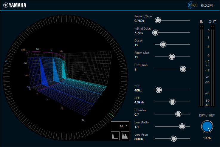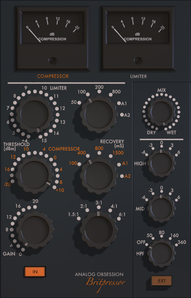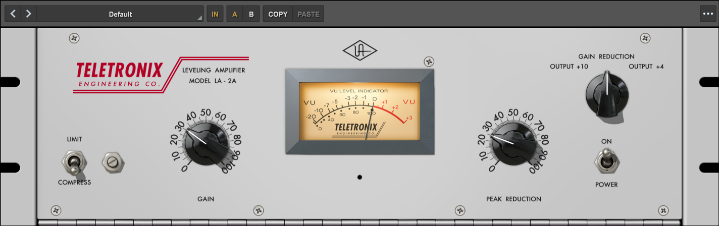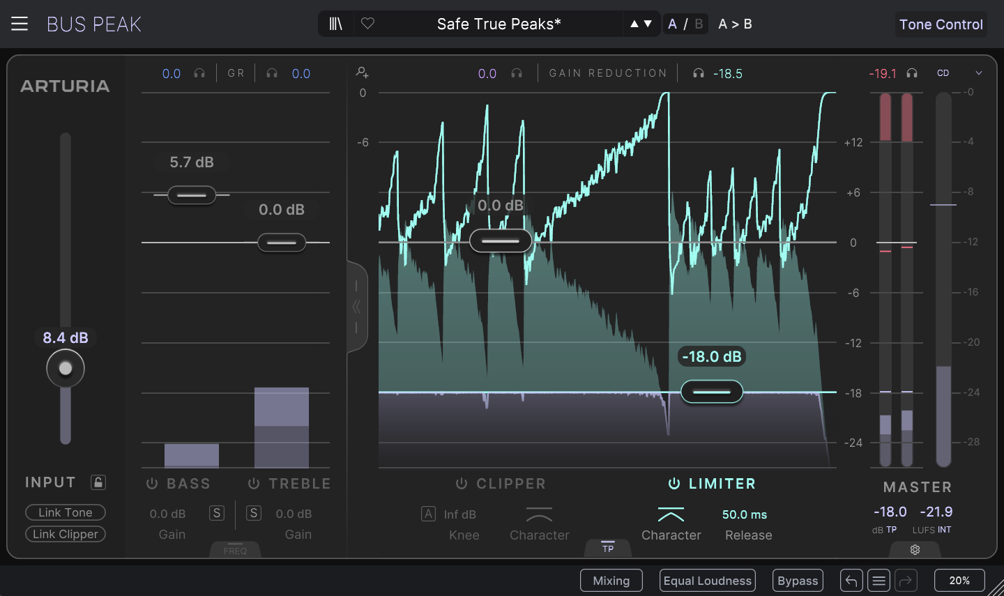 Dynamics processing featuring upward and downward compression as well as expansion. Thresholds and ratio are controlled by clicking and dragging on the visualization in the upper part of the plugin interface. The visualization shows how input levels are mapped to output levels by the dynamics processing. The current input and output levels are marked in the visualizer by a moving disc.